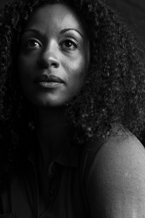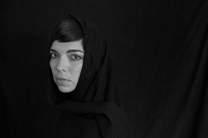 Studio fluorescent lights with umbrella reflector. (Model April Mercedes-Hart Garcia)