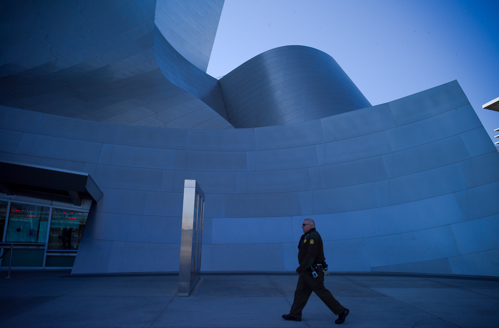 I didn’t notice any obvious edge distortion on the sides. I chose architecture to demonstrate this point.  Okay, it’s not fair with a building that already has curves. However, there is general distortion that’s noticeable on wide shots. For instance,  when you look at the officer walking towards the stainless steel signage in the middle of the picture, the sign leans toward him. But when you look at the concrete floor joint lines, they look pretty straight.