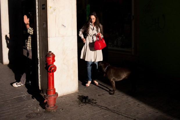 For example, when I was walking one day, I saw a woman with a dog and waited for them to pass. That in itself was not enough for a photograph. But very often if you keep looking, another element will come along and connect to your first element or to a new element. In this case, the woman with the red purse walked into the frame in the same area as the red fire hydrant and the dog.