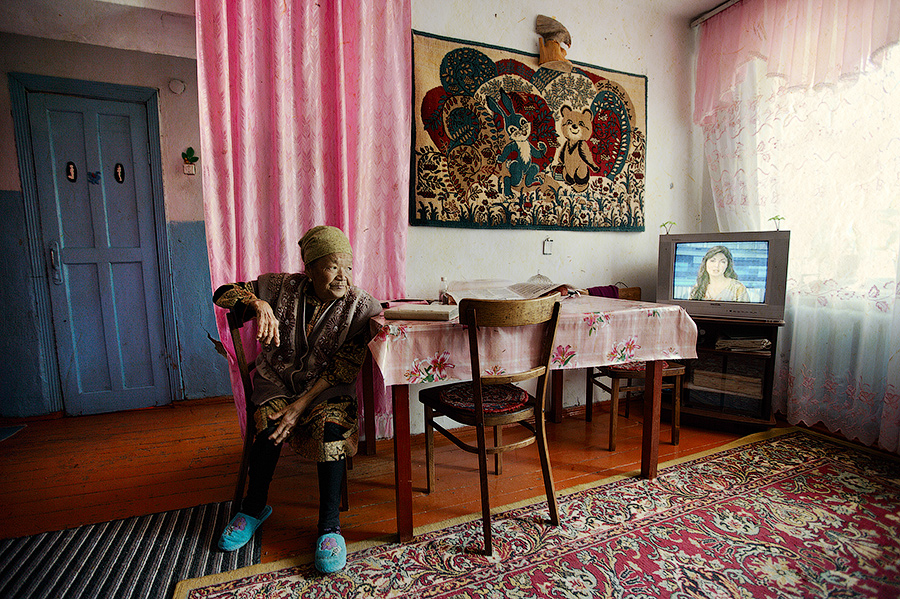 In this photo (below), what is interesting is not so much the picture but the story behind this woman. Her name is Kulipa. She lives in the village of Jeti-Oguz on Lake Issyk-Kul in Kyrgyzstan. She is 80 years old and raised 11 children in the one-room apartment with total area of about 30 square meters. Now her kids have grown up and gone to different cities and countries, but sometimes they come to visit their mother. They come with their wives, husbands and children, so in this tiny apartment sometimes there are 20-35 people. In this case, sleeping on the floor, one next to each other. It sleeps 10 people, therefore 10 or more are awake. They all take turns sleeping.