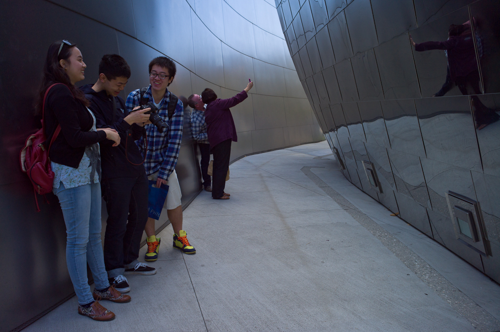 I didn’t notice any obvious edge distortion on the sides. I chose architecture to demonstrate this point.  Okay, it’s not fair with a building that already has curves. However, there is general distortion that’s noticeable on wide shots. For instance,  when you look at the officer walking towards the stainless steel signage in the middle of the picture, the sign leans toward him. But when you look at the concrete floor joint lines, they look pretty straight.