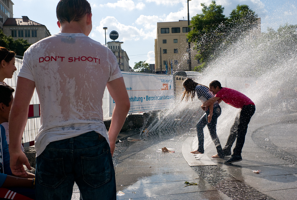 What makes Mario’s photographs stand out is these observations are taken to the next level by his juxtaposition of a situation against another situation within a scene. This man’s t-shirt combined with the water jets. Detail against detail.